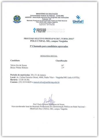 A Coordenação local do PROFIAP da UNIFAL-MG comunica que nos dias 30 e 31/03 ocorrerá a matrícula dos candidatos convocados na 3ª Chamada do Processo Seletivo 01/2017.