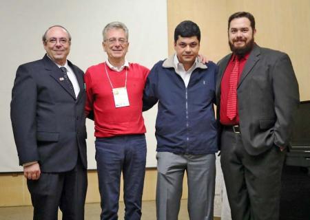 Prof. José Carlos de Souza Júnior (coordenador da Semana de Matemática), Prof. Gilberto Geraldo Garbi (escritor convidado), Prof. José Paulo Carvalho dos Santos (coordenador do curso de Matemática) e Prof. Eric Batista Ferreira (docente do curso)