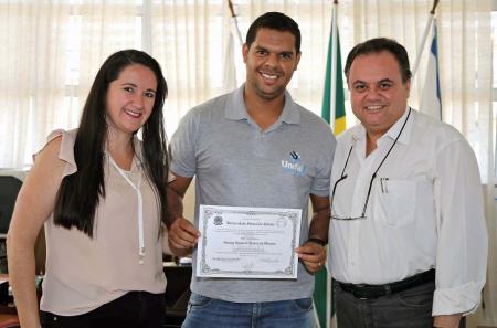 O técnico de laboratório George Augusto Veloso de Oliveira, do Instituto de Ciências Biomédicas da UNIFAL-MG, é mais um servidor a dar um importante passo no processo de qualificação acadêmica-profissional. Na manhã desta segunda-feira, 29/05, o técnico foi recebido no Gabinete da Reitoria, pelo reitor, Prof. Paulo Márcio de Faria e Silva, que fez questão de fazer a entrega do certificado de conclusão do mestrado em Química.