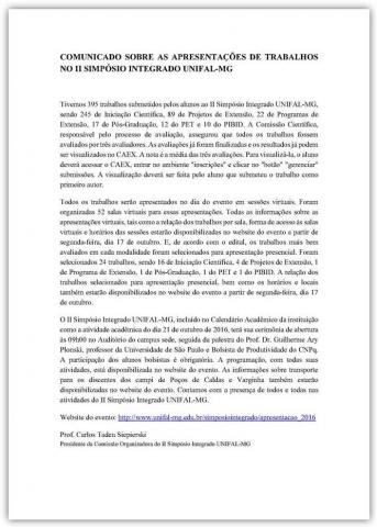 PRPPG divulga comunicado sobre apresentações de trabalhos 2º Simpósio Integrado