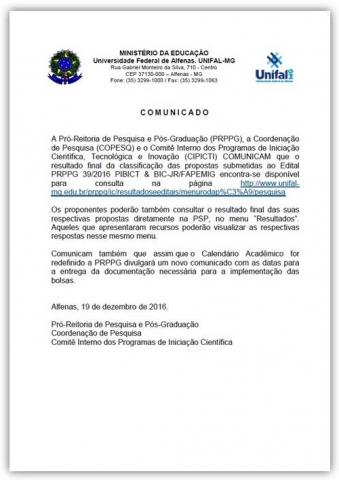 Para conferir o resultado, acesse: http://www.unifal-mg.edu.br/prppg/ic/resultadoseeditais/menurodap%C3%A9/pesquisa