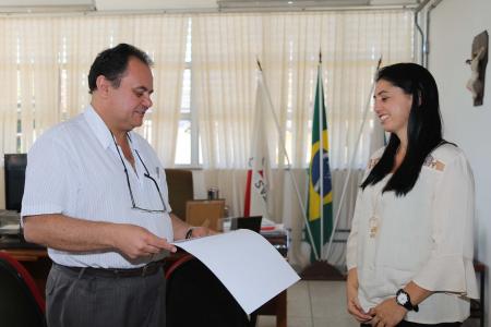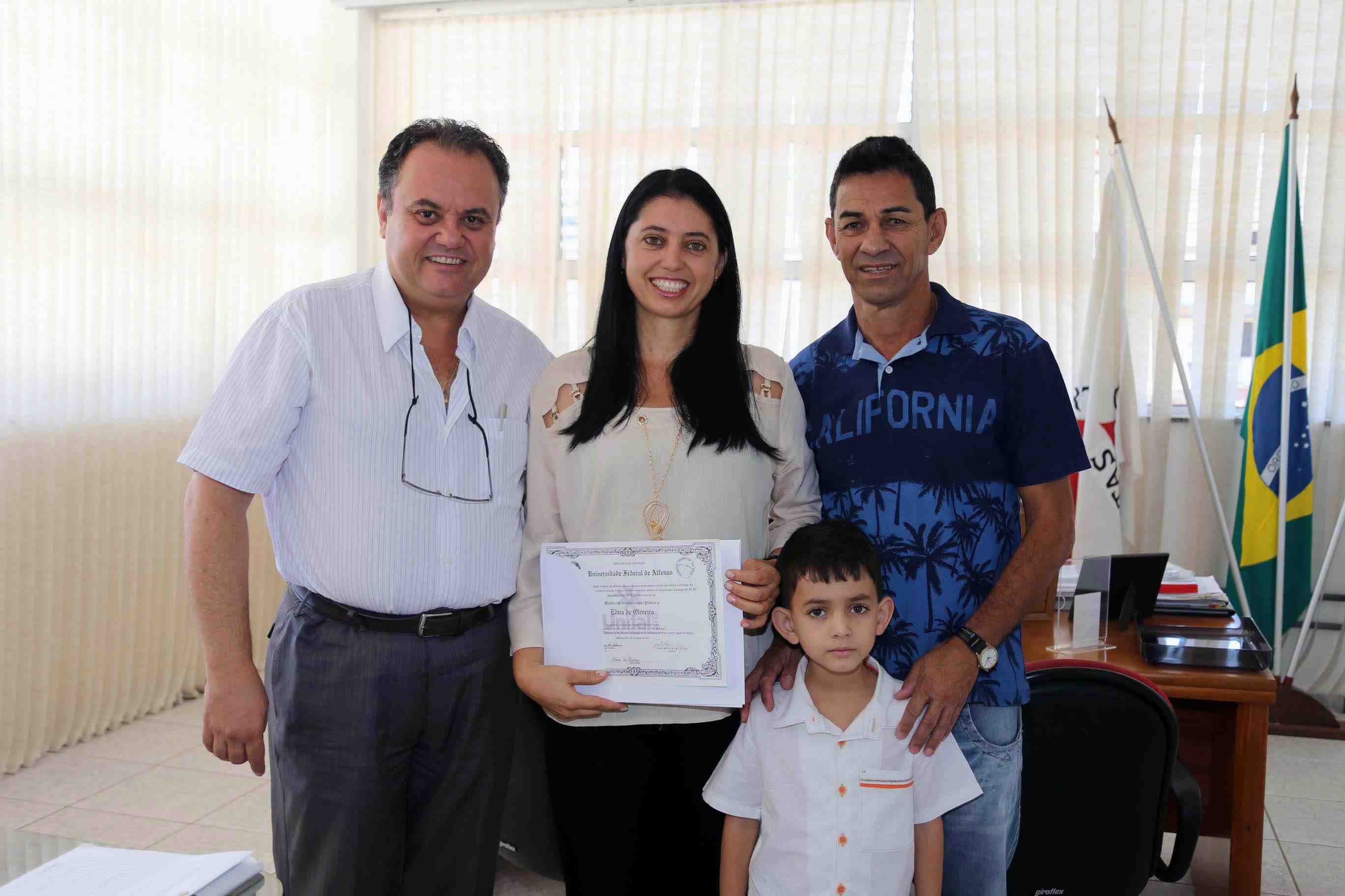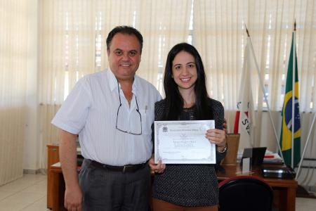 As servidoras do campus Varginha, professora Larissa Gonçalves Souza e a técnica-administrativa da assessoria pedagógica Edna de Oliveira receberam no dia 29/03, os certificados de conclusão de mestrado, que foram entregues pelo reitor, Prof. Paulo Márcio de Faria e Silva, no Gabinete da Reitoria.