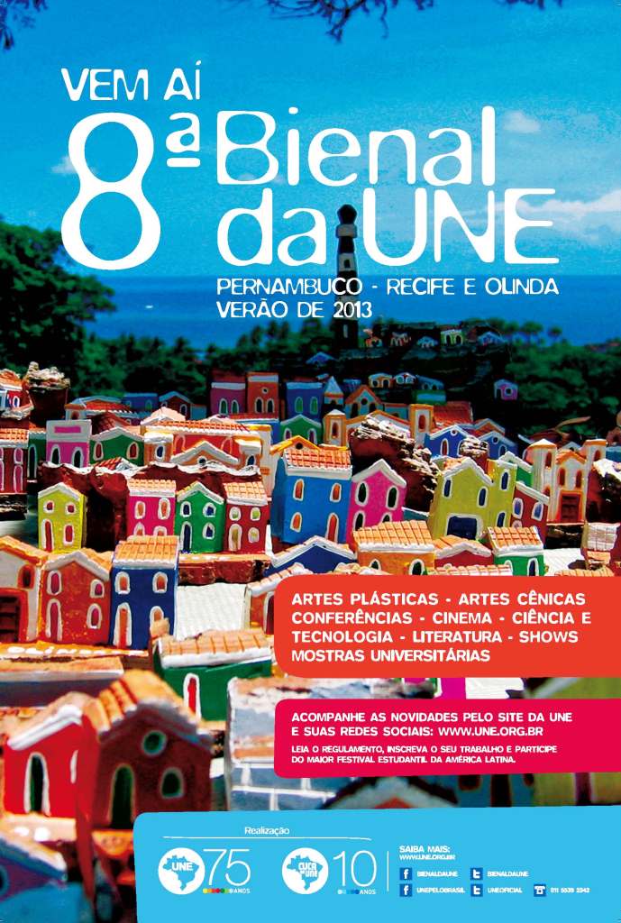Os estudantes do ensino superior, ensino médio e de pós-graduação que desejarem apresentar seus trabalhos culturais e científicos na 8ª Bienal da UNE (União Nacional dos Estudantes) já podem se inscrever pelo site da entidade (www.une.org.br ). O prazo é até o dia 07/12/2012. A Bienal, considerada o maior festival estudantil da América Latina, acontecerá entre os dias 22 e 26/01/2013 nas cidades de Recife e Olinda, em Pernambuco.