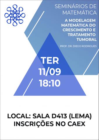 Nesta terça-feira, 11/09, acontece a 1ª atividade dos Seminários de Matemática: a palestra “Modelagem matemática do crescimento e tratamento tumoral”, proferida pelo Prof. Diego Rodrigues. O evento será às 18h10 na sala D-413 (LEMA), na Sede da UNIFAL-MG.