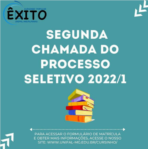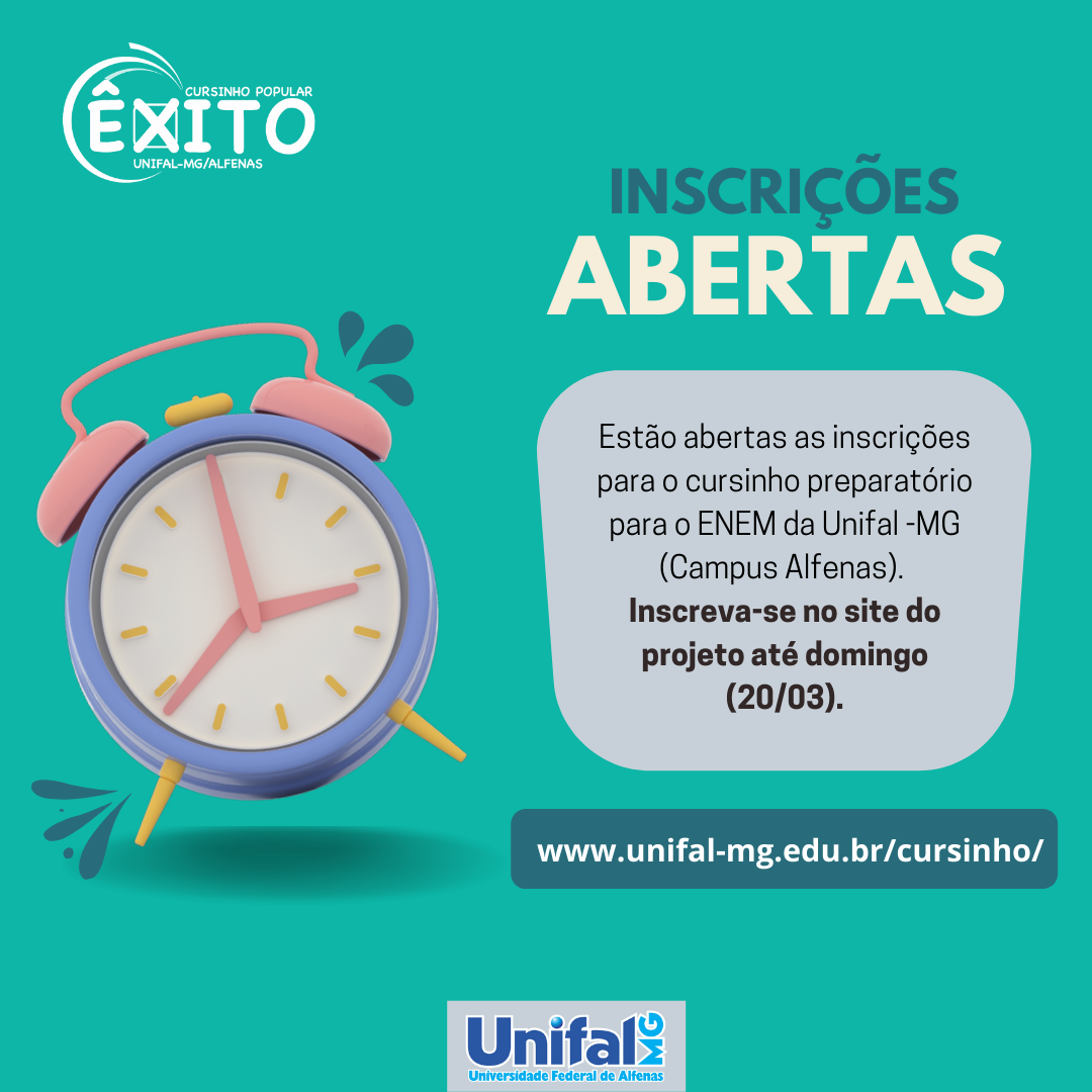 A equipe de gestão informa que, entre os dias 14 (segunda-feira) e 20 (domingo) de março, estarão abertas as inscrições para o processo seletivo do Cursinho Preparatório para o ENEM da Unifal-MG (ÊXITO) 2022. O projeto é voltado para o aperfeiçoamento de jovens e adultos egressos de escolas públicas que desejam se preparar para o Exame Nacional do Ensino Médio (ENEM).