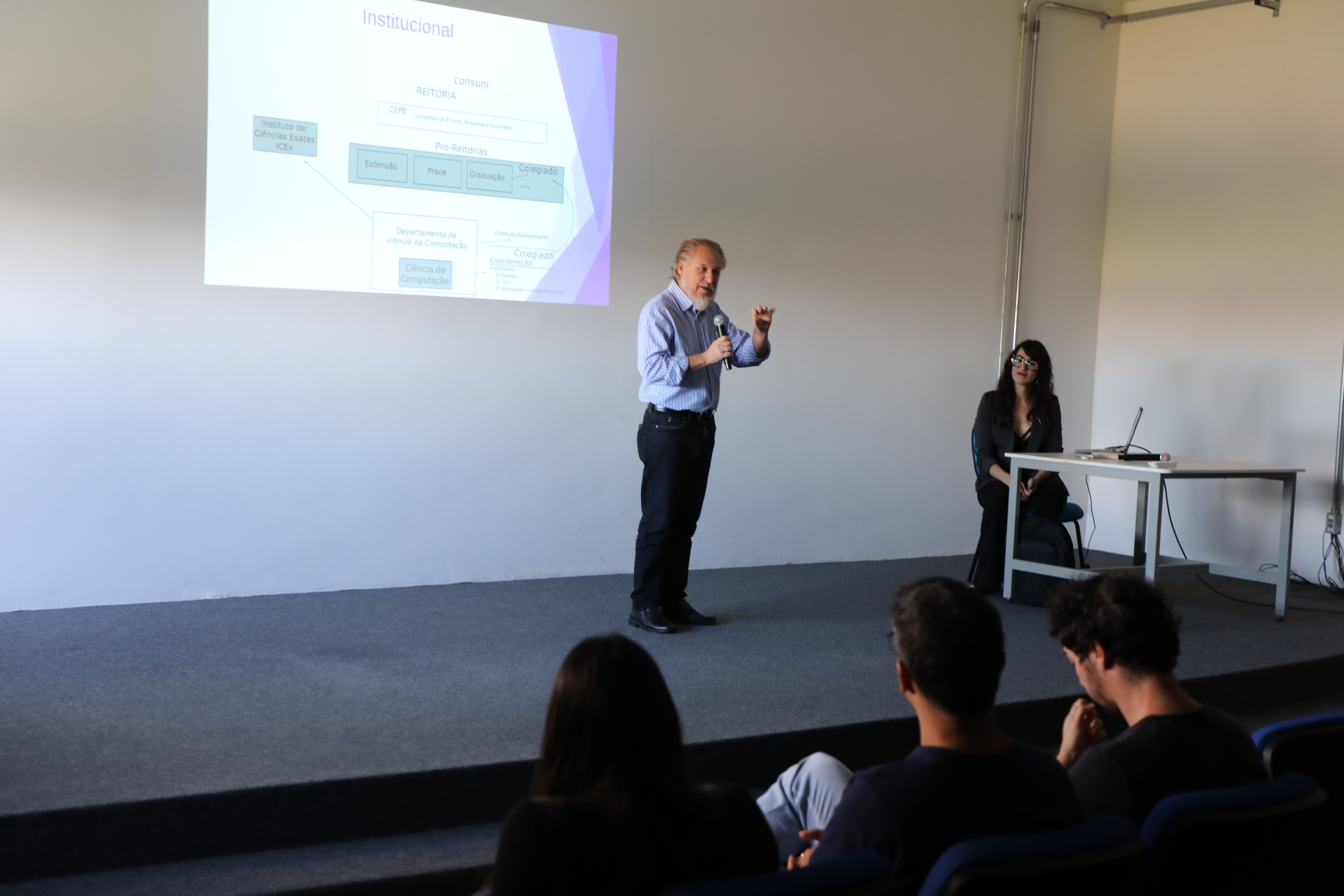 Em 27 de abril de 2023 reunimos no auditório do Campus Santa Clara da UNIFAL-MG os calouros de 2023 do Curso de Ciência da Computação para acolhe-los. Contamos com a participação de alguns dos professores do curso, como a Professora Mariane Moreira de Souza, coordenadora do curso, o Prof. Eliseu César Miguel, chefe do Departamento de Ciência da Computação, o diretor do Instituto de Ciências Exatas, o prof. Nelson José Freitas da Silveira, dos professores Luiz Eduardo da Silva, Flavio Barbieri Gonzaga, Paulo Alexandre Bressan, Iago Augusto de Carvalho e Rodrigo Martins Pagliares, e dos representantes da UNIFAL-MG José Francisco Lopes Xarão (Pró-reitor de Extensão), Roberta Seron Sanches (Pró-Reitora Adjunta de Graduação) e Cláudia Gomes (Pró-Reitoria de Assuntos Comunitários e Estudantis)