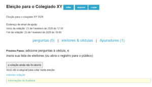 | Usar funcionalidade avançada de auditoria | Ao ativar essa opção, os eleitores terão acesso a funcionalidades que permitiriam auditar a eleição, contudo deixaria a interface um pouco mais complicada. Recomenda-se deixar desativada essa opção. |