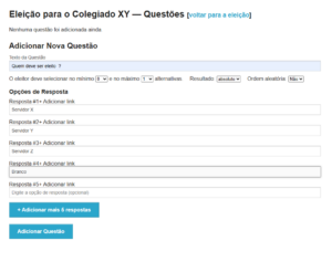 Na página inicial da eleição clique no botão Questões. É possível adicionar quantas questões forem necessárias.