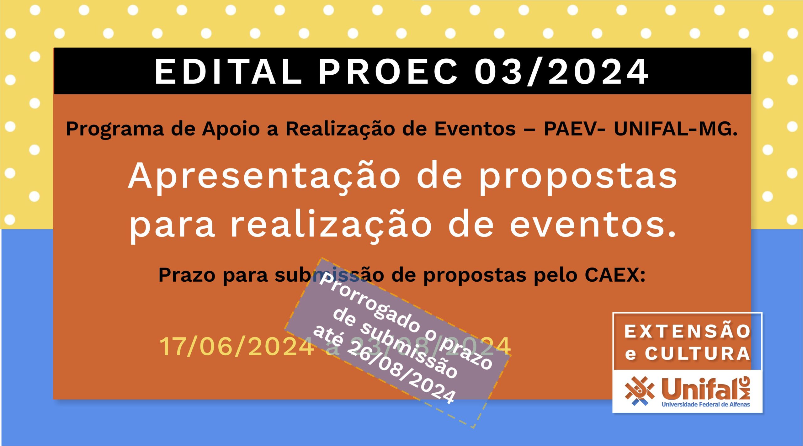 03/05/2024 – Clique aqui para acessar o Edital PROEC 03/2024 – Programa de Apoio a Realização de Eventos – PAEV
