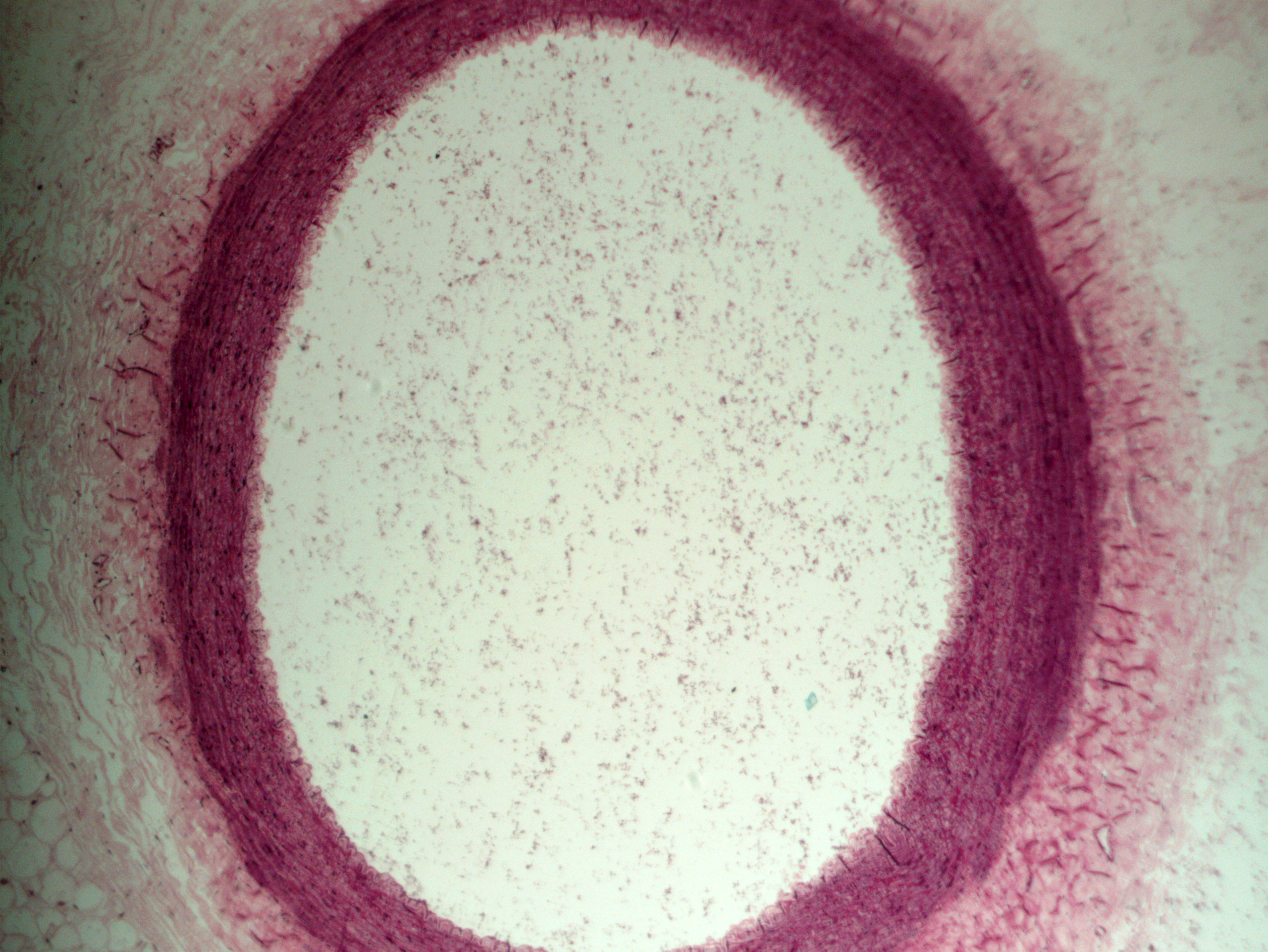 A túnica íntima da artéria muscular, ao contrário da artéria elástica, possui lâmina elástica interna bem delimitada. Ela separa a túnica íntima da média e se apresenta como uma faixa fenestrada de elastina que geralmente exibe ondulações devido à contração da camada de células musculares lisas da túnica média. A túnica média pode conter até 40 camadas de células musculares lisas dispostas concentricamente, e apresenta uma redução significativa nos componentes elásticos e um aumento nas fibras musculares lisas. Nos vasos maiores desse grupo, pode-se ver uma lâmina elástica externa fenestrada separando a túnica média da adventícia. Não se observa diferenças significantes na túnica adventícia.
