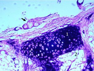 Corte de laringe em aumento de 40x, corado por Verhoeff. Os círculos indicam os condrócitos, as setas apontam para os condroblastos e o retângulo indica o pericôndrio.Corte de laringe em aumento de 20x, corado por Verhoeff. Em 1, observa-se o epitélio de revestimento pavimentoso estratificado e as setas apontam para as glândulas mucosas.