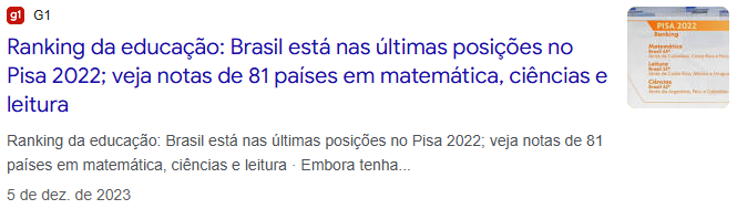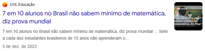 Segundo dados do Programa Internacional de Avaliação de Estudantes (Pisa) do ano de 2022, o Brasil está na posição 65° no ranking de Matemática dos 81 países que participaram da avaliação.