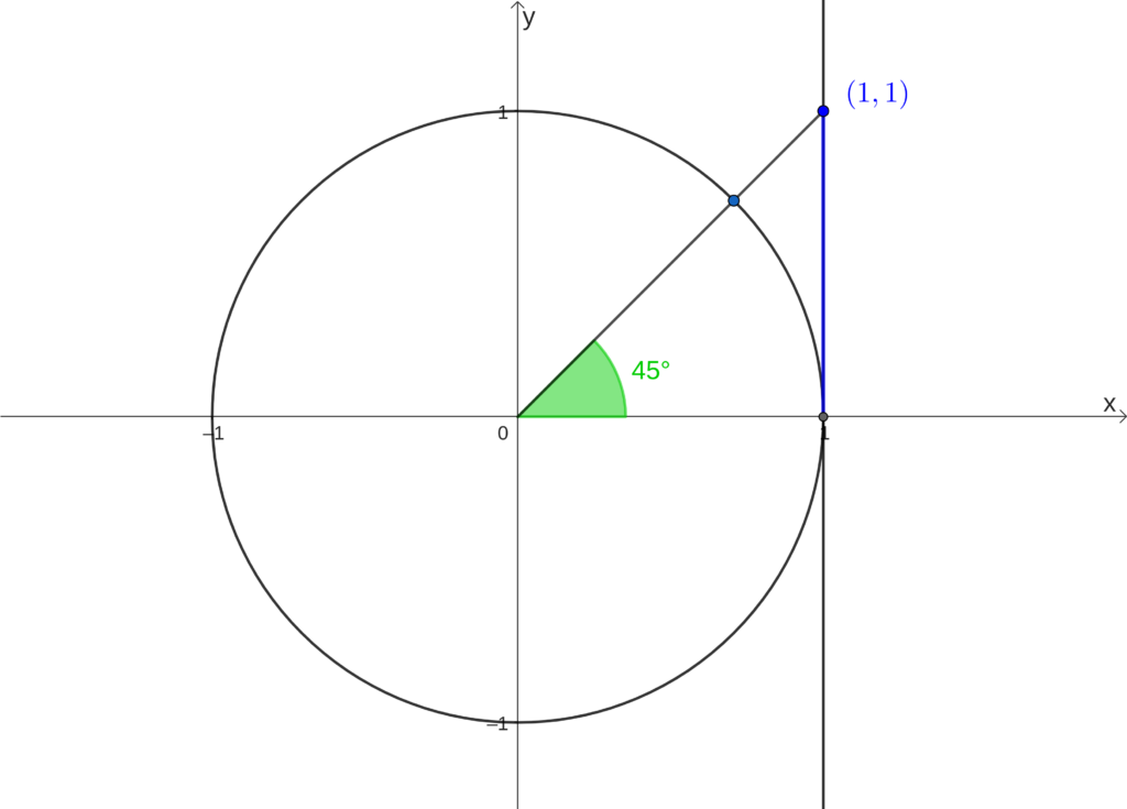 Ou seja, a tangente de um ângulo [math]\theta[/math] ([math]tg(\theta)[/math]) é determinada pela segunda coordenada do ponto D. Veja alguns exemplos: