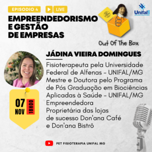 No dia 07 de novembro de 2022 o Projeto Out of the Box do PET Fisioterapia teve a honra de receber a Jádina Vieira Domingues. Ela é Fisioterapeuta pela Universidade Federal de Alfenas, Mestre e Doutora pelo programa de Biociências Aplicadas à Saúde da UNIFAL/MG. Fundadora e proprietária das lojas de sucesso Don’ana, Don’ana Café e Don’ana Bistrô.