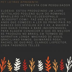 O novo projeto do PET “Entrevista com Pesquisador” tem como objetivo divulgar pesquisas relacionadas à área de Letras e afins. A entrevista dessa semana contou com a presença do professor Dr. Eloésio Paulo dos Reis, e o tema escolhido foi sobre Literatura: ensino, resenha e pesquisa.