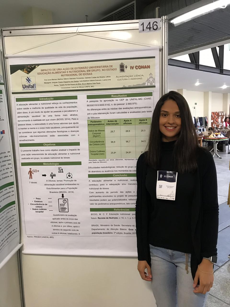 Estudantes da Faculdade de Nutrição (Fanut) tiveram a oportunidade de divulgar suas atividades de pesquisa e extensão desenvolvidas na UNIFAL-MG no 4º Congresso Nacional de Alimentos e Nutrição (CONAN), realizado no Centro de Convenções da UFOP, em Ouro Preto-MG, entre os dias 27 e 31/05. O congresso reuniu profissionais e estudantes das áreas de Ciência de Alimentos, Gastronomia, Alimentação e Nutrição com a meta de promover a atualização profissional nas vertentes de desenvolvimento científico, avanço tecnológico e busca da inovação, com vistas às melhores práticas profissionais.