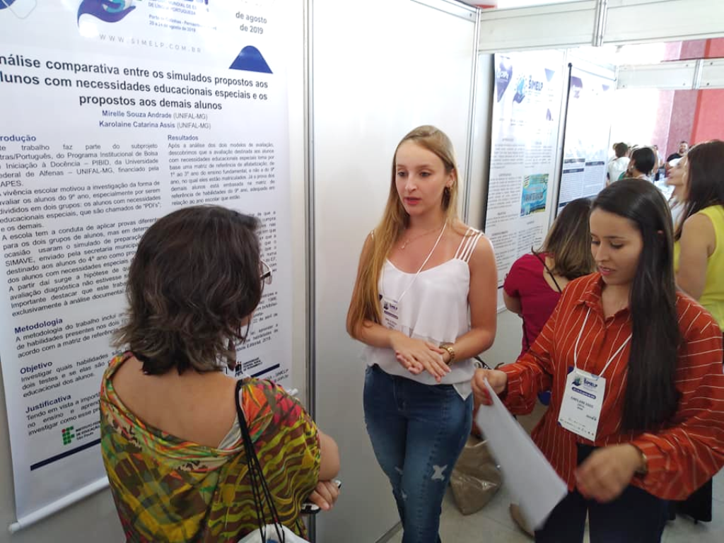 Já as alunas Mirelle Souza Andrade e Karolaine Assis apresentaram um trabalho sobre avaliação diagnóstica de habilidades de leitura intitulado “Análise comparativa entre os simulados propostos aos alunos com necessidades educacionais especiais e os propostos aos demais alunos”. Para Mirelle a experiência foi enriquecedora: “os trabalhos me ajudaram, enquanto professora em formação, a ter uma visão mais esclarecida sobre alguns aspectos da língua portuguesa e seu ensino. É importante essa representação do PIBID, expondo o que nós, bolsistas, estamos fazendo e os benefícios que o programa traz aos envolvidos”. Karolaine relata que a oportunidade de estar em um evento tão importante trouxe para sua formação a esperança de uma educação que pode ser transformada. “Quando desenvolvemos nossa pesquisa não temos dimensão do quanto o resultado poderá ajudar não somente os graduandos, mas pessoas experientes, tendo maior foco nos alunos”, disse.