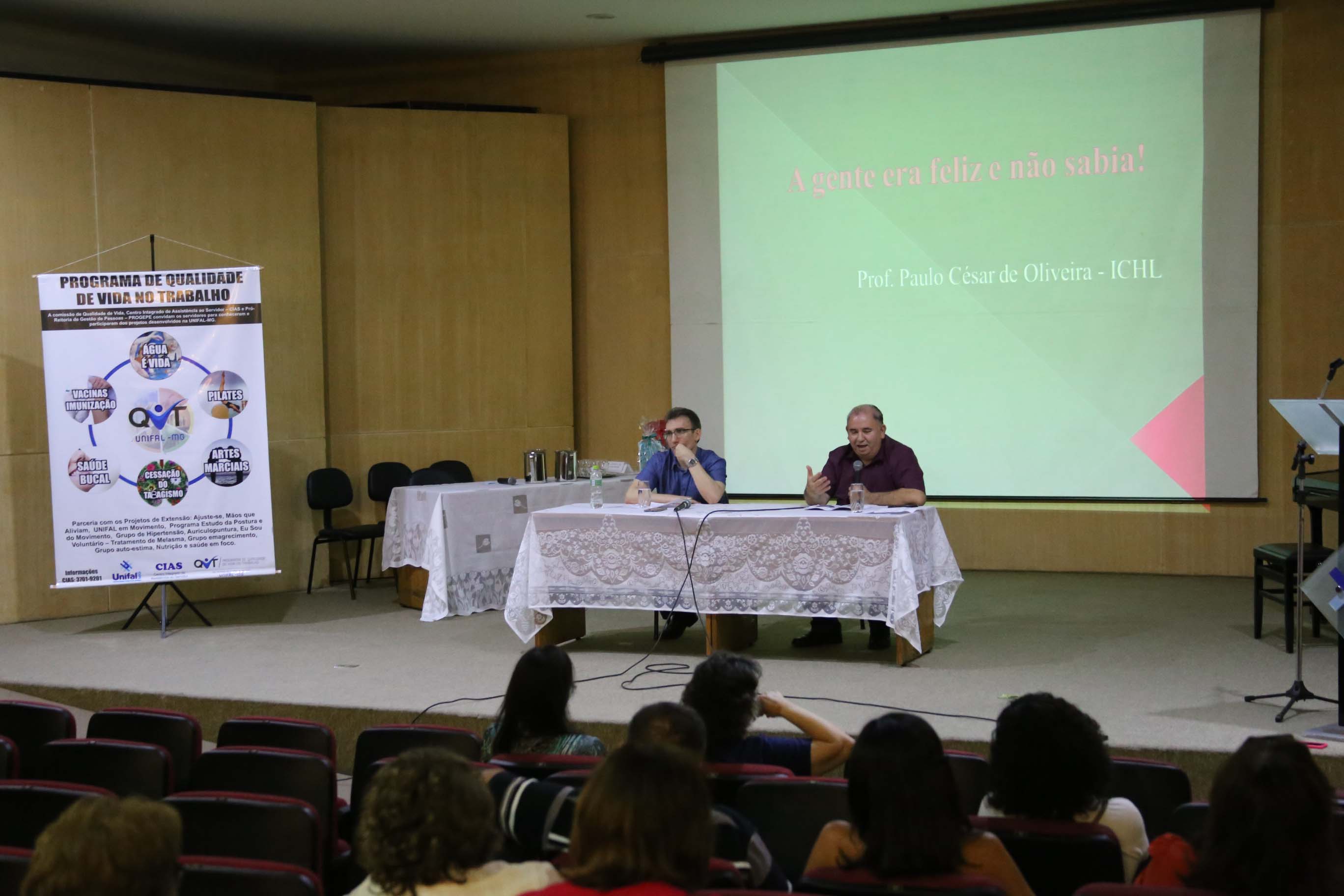A Comissão de Qualidade de Vida no Trabalho (QVT) promoveu, na tarde desta terça-feira (22/10), um bate-papo sobre “Felicidade e Saúde Mental”, a fim de proporcionar aos servidores da UNIFAL-MG um momento de interação e reflexão. A atividade, que integra as comemorações do Dia do Servidor Público, contou com a participação dos professores Paulo César de Oliveira, do Instituto de Ciências Humanas e Letras (ICHL), e Paulo Baisi, da Faculdade de Medicina, que realizaram as palestras sobre o tema.