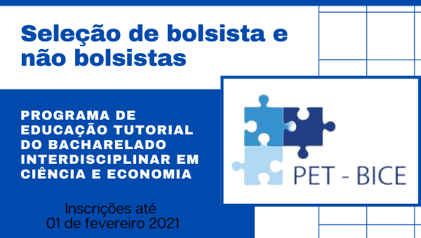 A Pró-Reitoria de Graduação da UNIFAL-MG comunica que estão abertas as inscrições para o processo seletivo do Programa de Educação Tutorial do Bacharelado Interdisciplinar em Ciência e Economia (PET BICE) do campus Varginha.