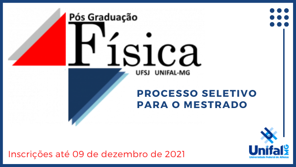 Interessados(as) em participar do processo seletivo do Programa de Pós-Graduação em Física, promovido por meio de “Associação Ampla” entre as universidades federais de Alfenas (UNIFAL-MG) e São João Del Rei (UFSJ), devem realizar suas inscrições até 09 de dezembro de 2021, neste link.
