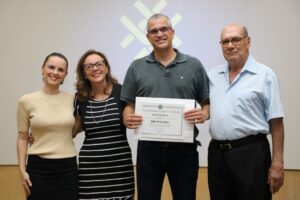 A farmacêutica Elaine Gonçalves da Silva homenageou a professora Cássia Carneiro Avelino e o colega Antônio Élcio Silvestre prestou homenagem à organizadora de eventos da UNIFAL-MG, Michelle Ananias.