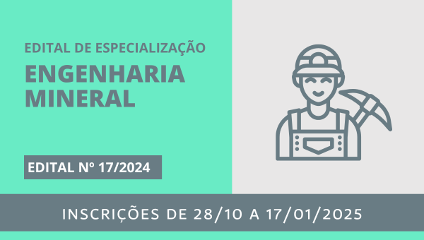 Interessados(as) em realizar o curso de Especialização em Engenharia Mineral na UNIFAL-MG, campus Poços de Caldas, poderão realizar suas inscrições entre os dias 28/10 e 17/01/2025, neste link.