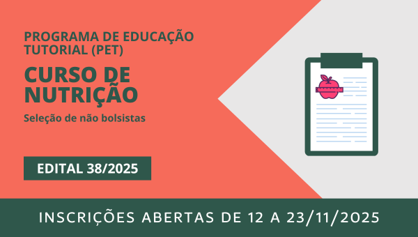 A Pró-Reitoria de Graduação (Prograd) divulgou o edital do processo seletivo de não bolsistas do Programa de Educação Tutorial (PET) do curso de Nutrição da UNIFAL-MG. São oferecidas 3 vagas para não bolsistas.