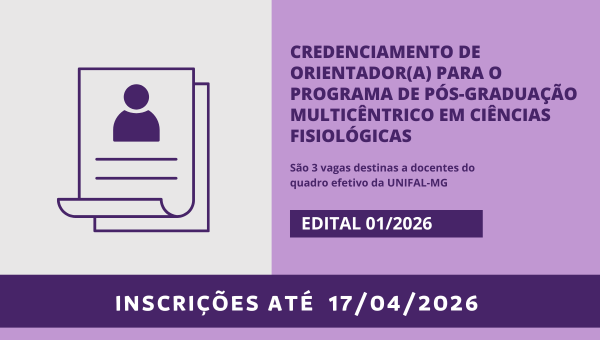Estão abertas as inscrições para o credenciamento de orientadores(as) do Programa de Pós-Graduação Multicêntrico em Ciências Fisiológicas (PPGMCF) da UNIFAL-MG. Ao todo, são ofertadas 3 vagas, destinadas a docentes do quadro efetivo da UNIFAL-MG.