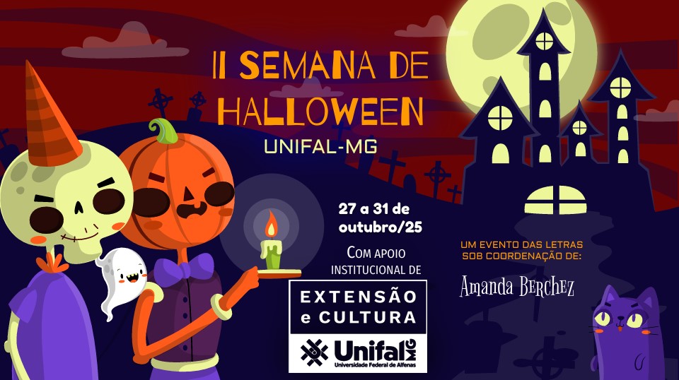 O Núcleo de Línguas (NUCLI) realizará, entre os dias 27 e 31 de outubro, a “2ª Semana de Halloween da UNIFAL-MG”. O evento, organizado por discentes dos cursos de Letras e coordenado pela Profa. Amanda Naves Berchez, contará com palestras, oficinas, sessões de cinema, atividades interativas, apresentações artísticas, grupos de estudo, bingo temático, clube de leitura e uma confraternização de encerramento.