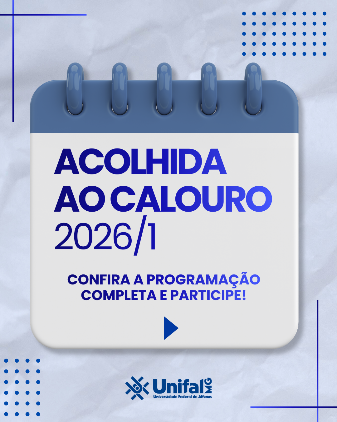 A Universidade Federal de Alfenas, Campus Poços de Caldas, promove, entre os dias 02 e 06 de março, a Acolhida aos Calouros, atividade institucional destinada aos estudantes ingressantes, com o objetivo de orientar, integrar e informar sobre a estrutura acadêmica e as oportunidades oferecidas pela Universidade.