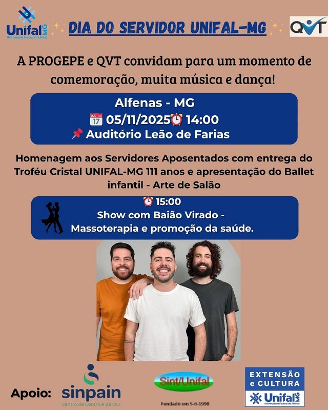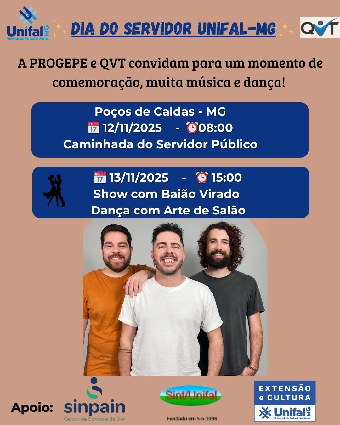Nos dias 05, 06 e 12/11, a UNIFAL-MG comemorará o “Dia do Servidor Público” com atividades em Alfenas, Poços de Caldas e Varginha. O evento contará com apresentações artísticas musicais e culturais, homenagem aos servidores aposentados, show de talentos, exercícios laborais, massagem e caminhada.