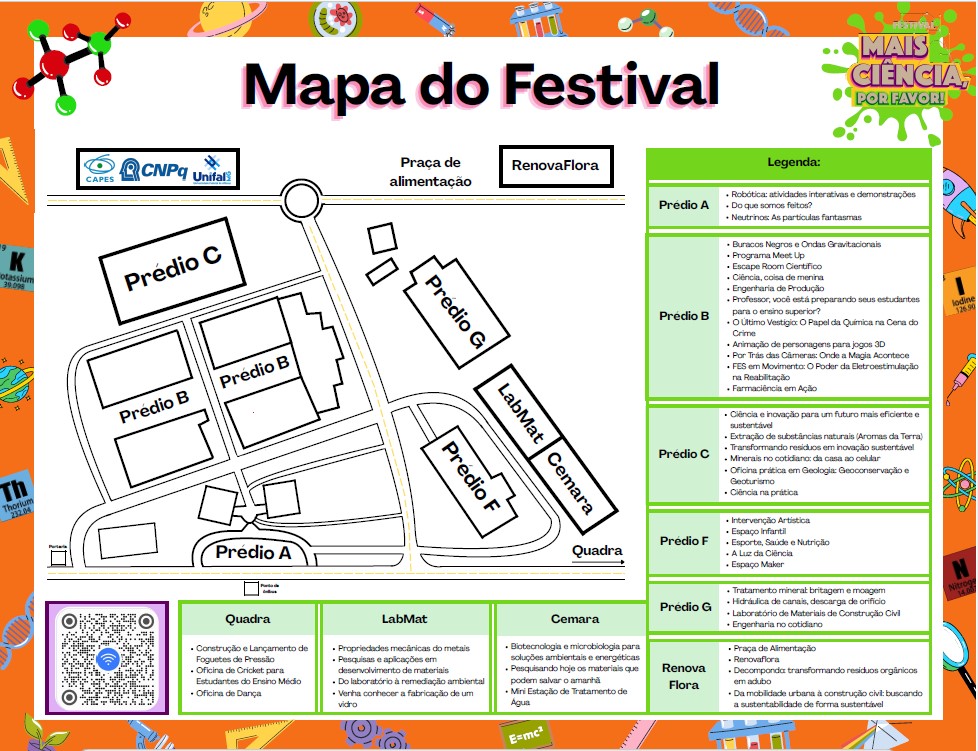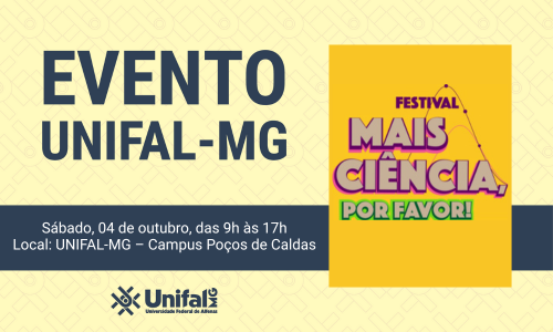 A UNIFAL-MG, Campus Poços de Caldas, sediará no dia 04/10 o “Festival Mais Ciência, Por Favor!”. O evento, organizado por meio do projeto “Construindo Juntos: Ações Extensionistas na Pós-Graduação para Desafios Sustentáveis e Inclusivos na Sociedade”, contará com visitas guiadas aos laboratórios, oficinas, palestras, brinquedoteca científica, espaço de alimentação e intervenções artísticas e culturais.
