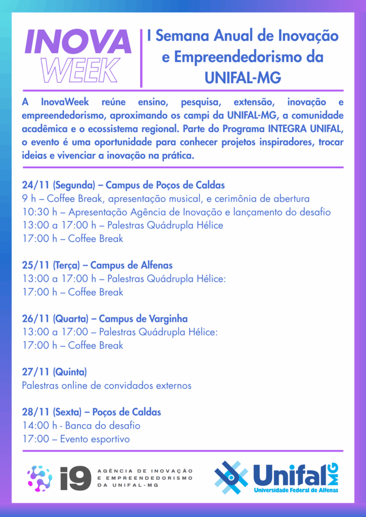 A Agência de Inovação e Empreendedorismo (I9) da UNIFAL-MG, em parceria com a Pró-Reitoria de Pesquisa e Pós-Graduação (PRPPG), promoverá, entre os dias 24 e 28 de novembro, a “InovaWeek – 1ª Semana Anual de Inovação e Empreendedorismo da UNIFAL-MG”.