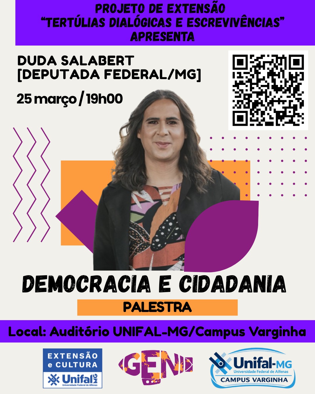 A UNIFAL-MG – Campus Varginha receberá a deputada federal Duda Salabert (PDT/MG) no dia 25/03, às 19h, para a palestra “Democracia e Cidadania”. A atividade integra as ações do projeto de extensão “Tertúlias Dialógicas e Escrevivências”, que reforça o compromisso da universidade em promover debates públicos e formar cidadãos críticos e engajados.