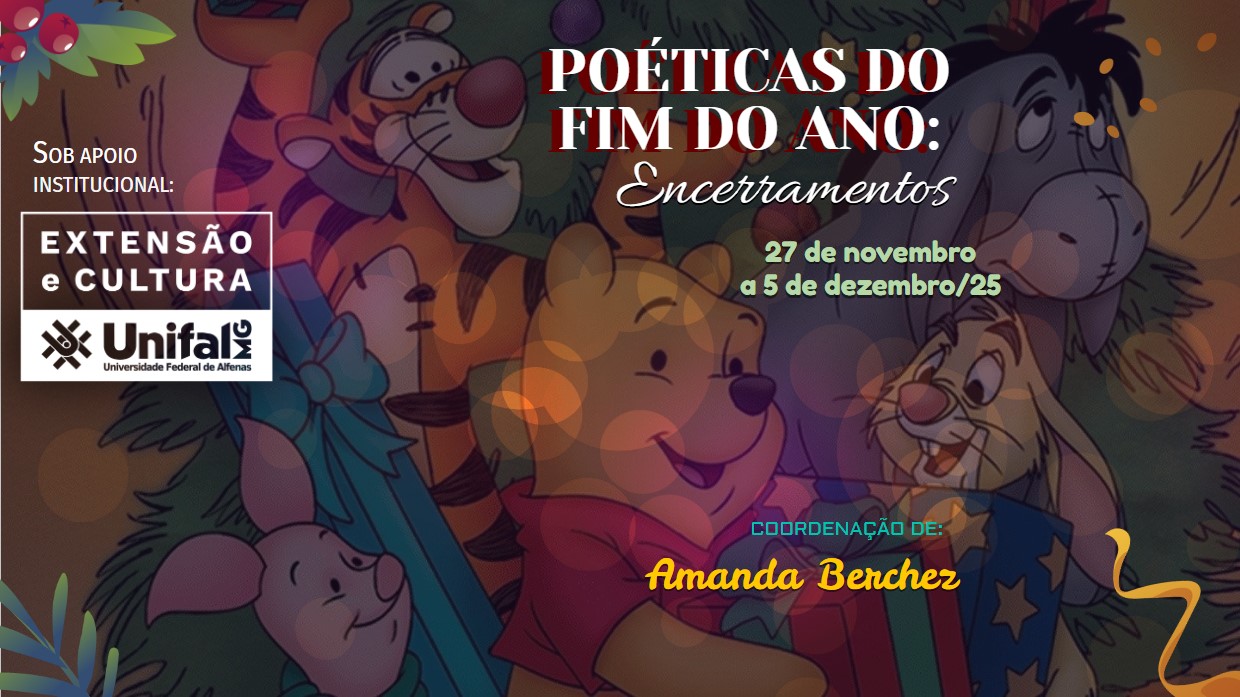 O Instituto de Ciências Humanas e Letras (ICHL), por meio da disciplina de Teoria Literária II do curso de Letras da UNIFAL-MG, promoverá, entre os dias 27 de novembro e 5 de dezembro de 2025, o evento “Poéticas do fim do ano: Encerramentos”. De natureza acadêmica e cultural, a iniciativa tem como objetivo desenvolver atividades relacionadas à área de Letras articuladas à temática de fim de ano, fomentando a reflexão estética, simbólica e cultural sobre o período.