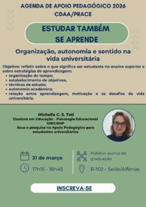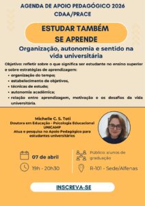 📅 07 de abril | 19h às 20h30 | Presencial (R-101)Tema: Técnicas de estudo e autonomia acadêmica |