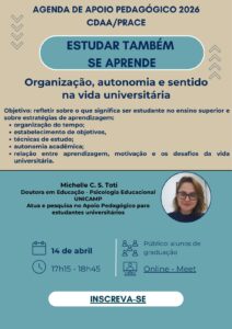 📅 14 de abril | 17h15 às 18h45 | Online (Google Meet)Tema: Motivação, aprendizagem e desafios da vida universitária |