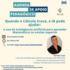 E, no dia 02/09, o Prof. Me. Ronaldo Lopes fará a atividade presencial “Quando o Cálculo trava, a IA pode ajudar: o uso da inteligência artificial para aprender Matemática no ensino superior”. Essa atividade reque inscrição prévia, devido ao número limitado de vagas (Inscrições: https://forms.gle/iXmoTFD21YwbKDMt9)