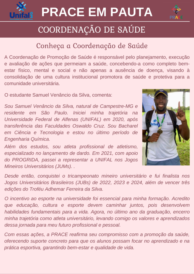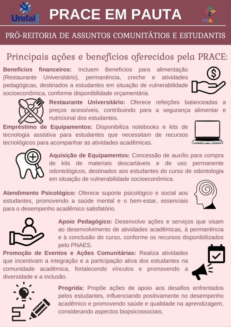 As ações institucionais de apoio à permanência estudantil são essenciais para o sucesso acadêmico dos estudantes. E, pensando nisso, queremos divulgar as histórias de sucesso que acompanhamos aqui na Prace. Essa é a primeira edição do nosso Boletim “Prace em Pauta”. Acompanhe e divulgue as histórias, para fortalecermos essa importante dimensão da Universidade