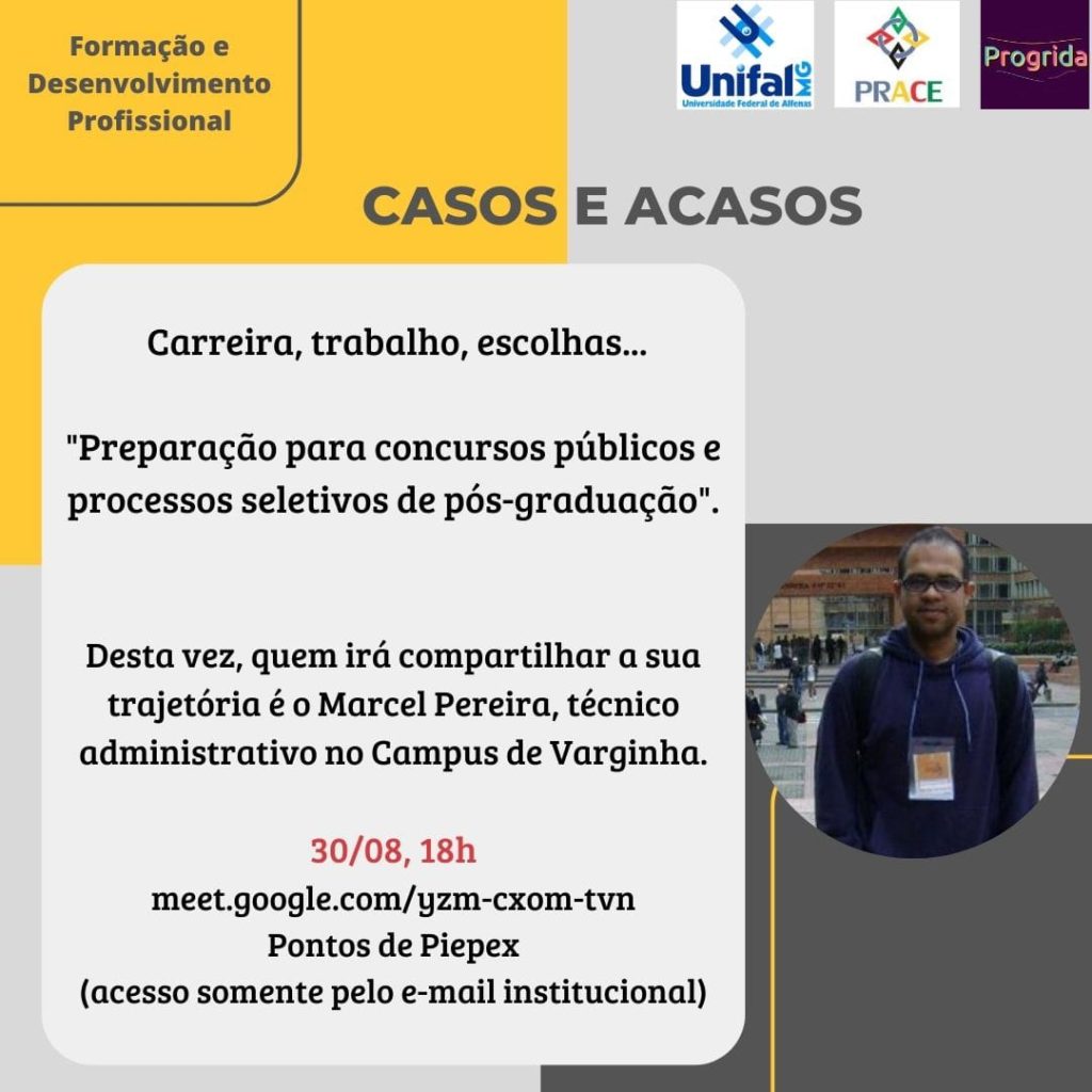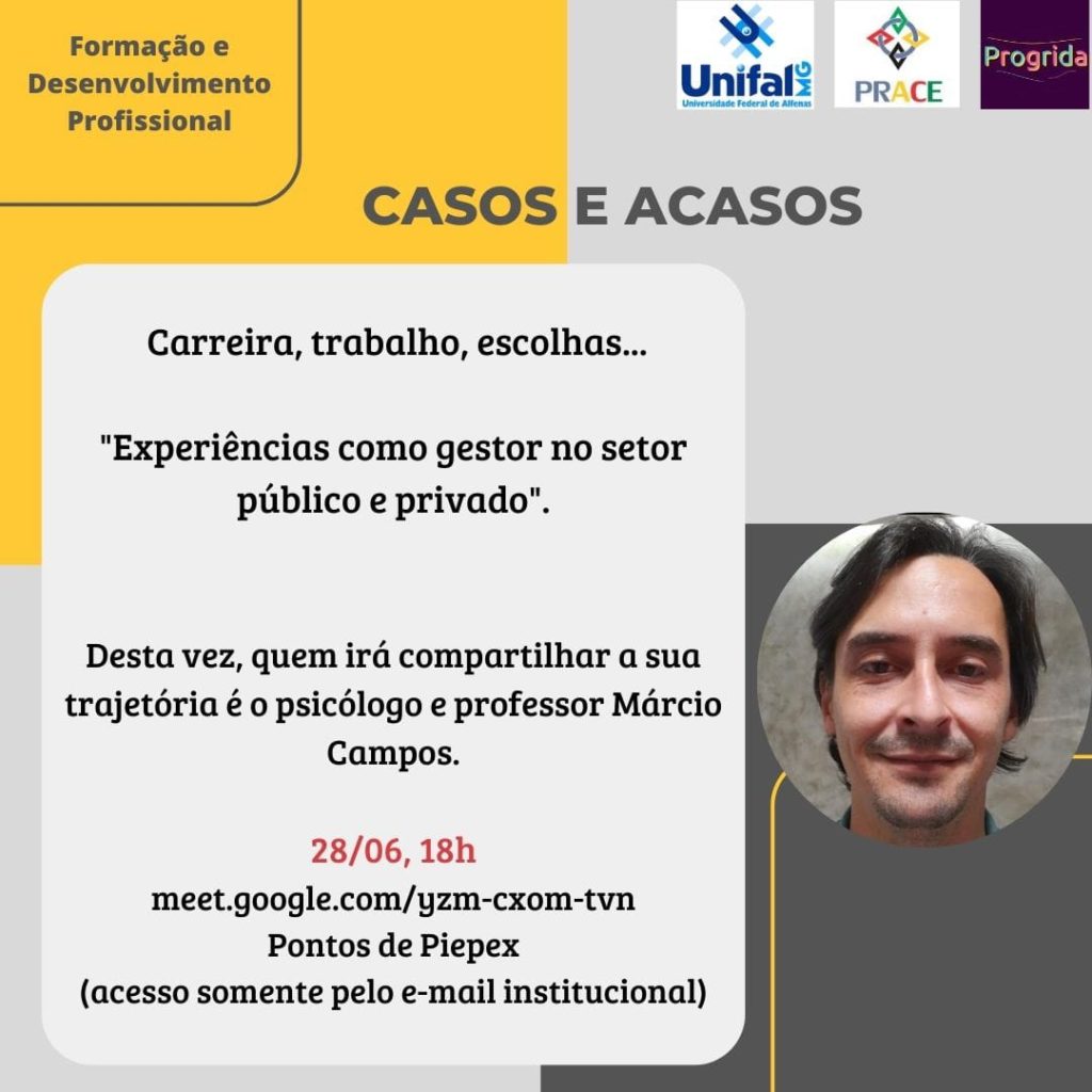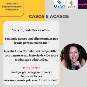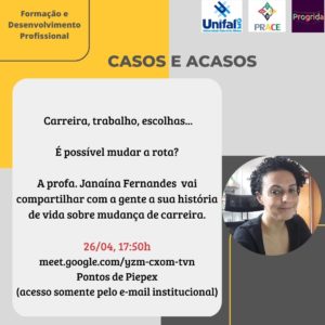 O primeiro encontro do “Casos e Acasos” será no dia 26/04/23, sobre o tema mudança de carreira. Quem participará conosco é a professora Janaína de Mendonça Fernandes. Ela irá compartilhar conosco a sua história de vida profissional e suas mudanças de carreira ao longo desse percurso.