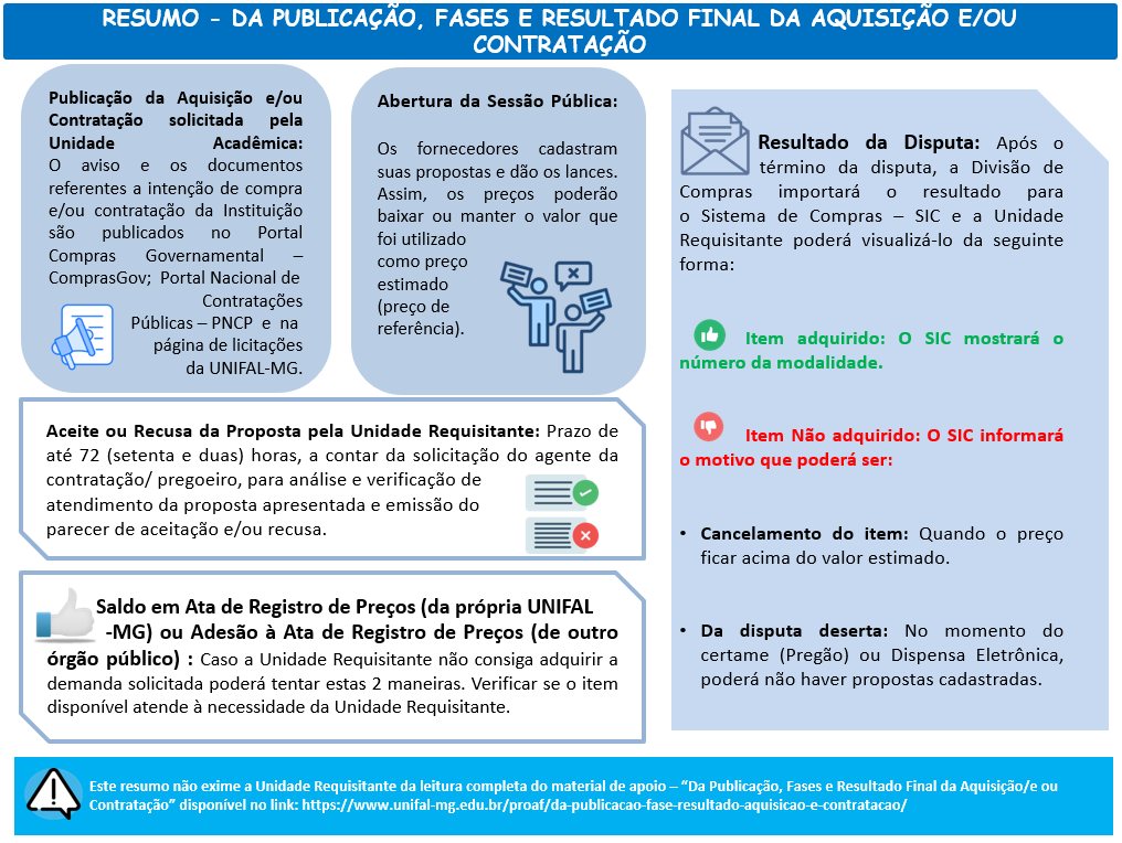 O aviso e os documentos referentes à intenção de compra e/ou contratação da UNIFAL-MG são publicados no site do Portal Compras Governamental – ComprasGov; Portal Nacional de Contratações Públicas – PNCP e na página de licitções da UNIFAL-MG. Após essa etapa, segue-se a abertura e análise de propostas recebidas, se houver, que atendam à demanda solicitada pela Unidade Requisitante.