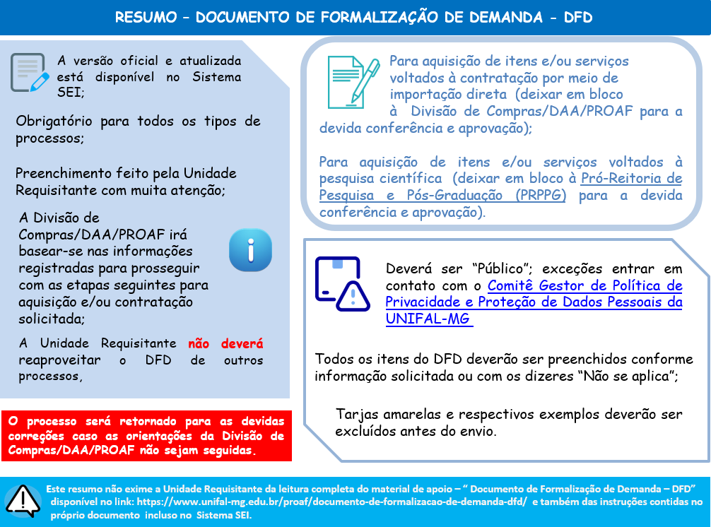 ATENÇÃO!!! Caso as orientações da Divisão de Compras/DAA/PROAF não sejam seguidas, o DFD será restituído à Unidade Requisitante para as devidas correções. |