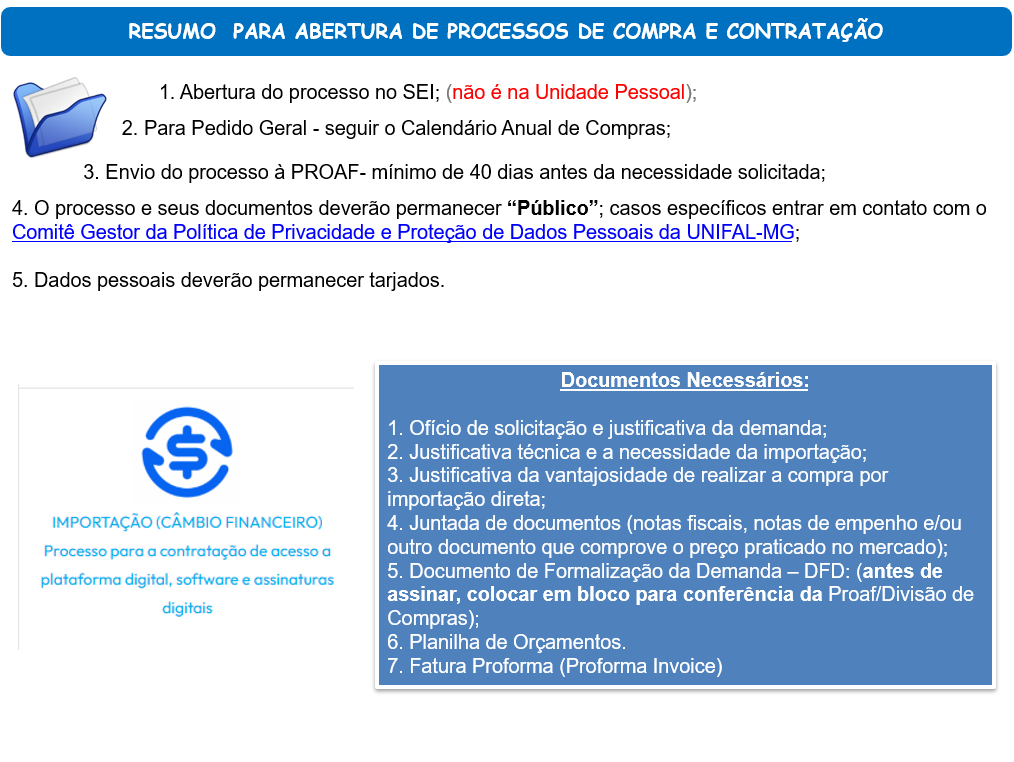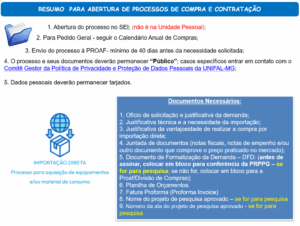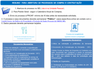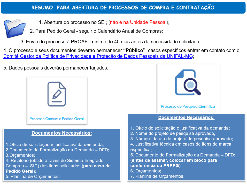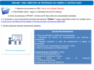 ATENÇÃO! Os resumos abaixo não eximem a Unidade Requisitante da leitura completa das informações contidas no material de apoio – “Abertura e Tipos de Processos”. |