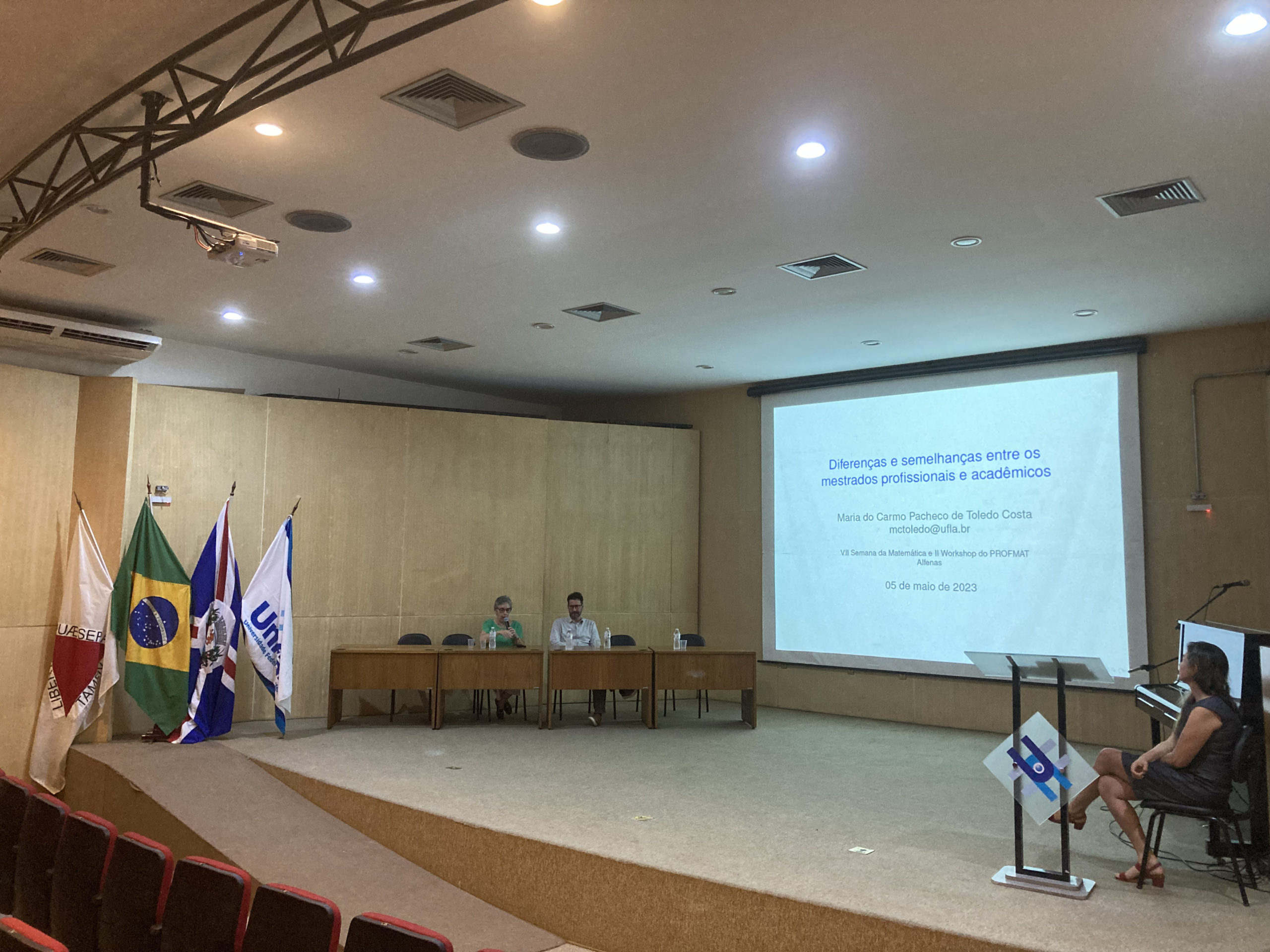 No dia 5 de maio, aconteceu o II Workshop PROFMAT da UNIFAL-MG. Tivemos a honra de receber a Profa. Dra. Maria do Carmo Pacheco de Toledo Costa (UFLA), que ministrou uma palestra sobre a importância da capacitação docente para a melhoria da qualidade do ensino de Matemática. Em seguida, tivemos uma mesa redonda sobre as diferenças e semelhanças entre mestrados profissionais e acadêmicos, com a participação da Profa. Dra. Cátia Quiles Queiroz (UNIFAL), da Profa. Dra. Maria do Carmo Pacheco de Toledo Costa (UFLA) e do Prof. Dr. Frederico Augusto Toti (UNIFAL). Foi um momento de aprendizado e reflexão para todos os presentes.