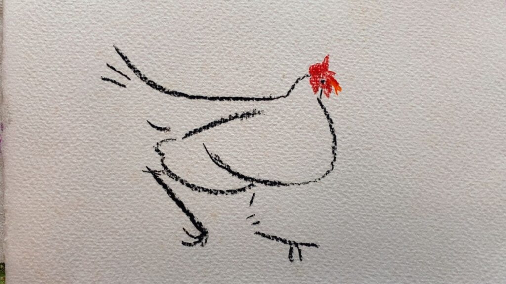 Descrever o máximo do símbolo como o mínimo significante: este é, e foi, o objetivo. Os desenhos em carvão foram feitos a partir das fotografias de autoria do meu pai, das galinhas da compostagem. Deixo as linhas pretas, vermelhas e amarelas comunicarem por si o que as palavras comunicariam de outra forma: por isso da breve explicação, afinal o objetivo do artista não é definir o que é arte, mas é, na verdade, extrapolá-la.