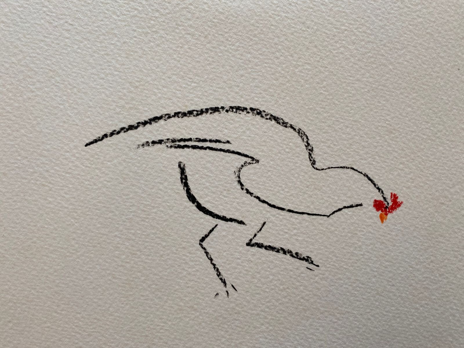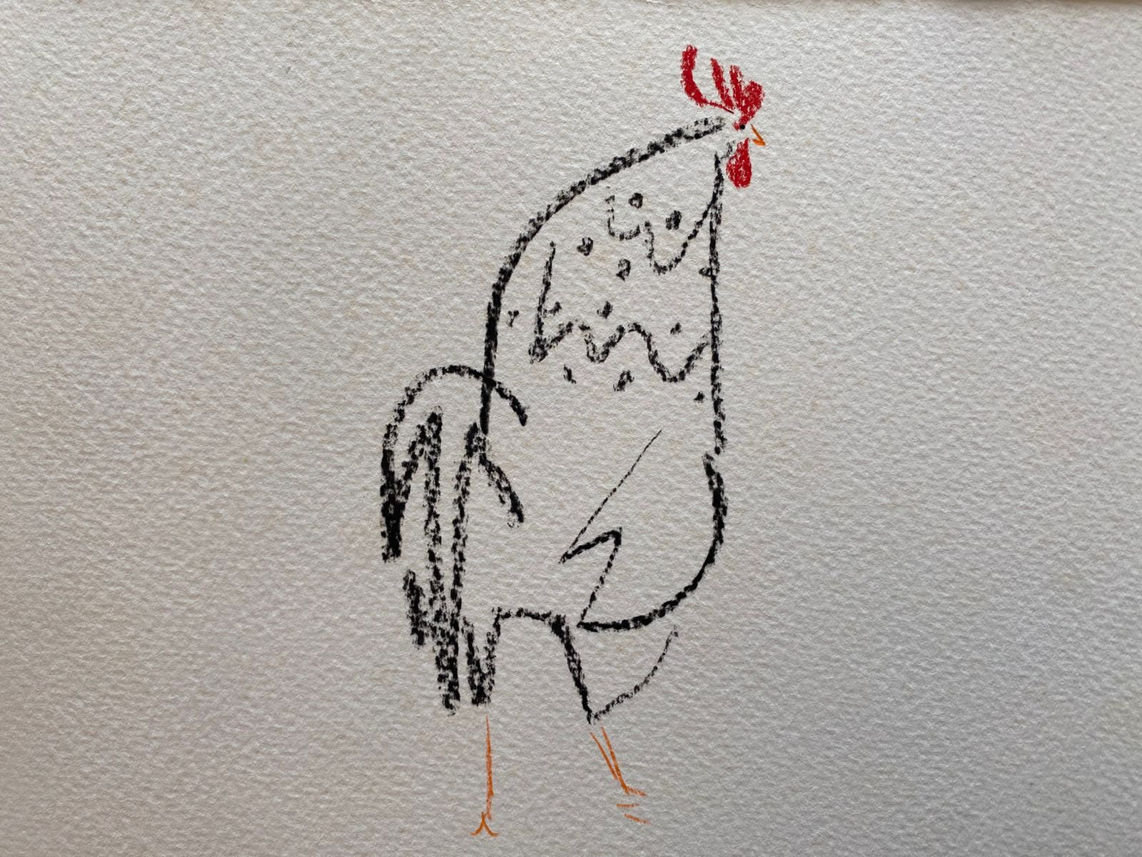 Descrever o máximo do símbolo como o mínimo significante: este é, e foi, o objetivo. Os desenhos em carvão foram feitos a partir das fotografias de autoria do meu pai, das galinhas da compostagem. Deixo as linhas pretas, vermelhas e amarelas comunicarem por si o que as palavras comunicariam de outra forma: por isso da breve explicação, afinal o objetivo do artista não é definir o que é arte, mas é, na verdade, extrapolá-la.
