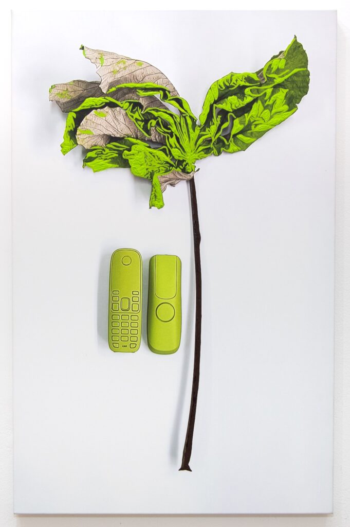 As três fotografias pictóricas com intervenções em acrílica, aqui apresentadas, fazem parte da série ANTROPO MORIFAS (avessos). Nessas obras, joysticks, frigideiras e telefones convivem com folhas secas de embaúba, todos recobertos por camadas de esmalte spray e tinta acrílica em cores vibrantes. Ao romper com a homogeneização cromática típica da indústria, crio composições que ressaltam a singularidade e a potência estética desses objetos, instaurando novas camadas de sentido. Em ANTROPO MORFIAS (avessos), a proposta é entrelaçar matéria viva e matéria fabricada. Objetos como telefones, frigideiras e joysticks convivem com folhas de embaúba, cujas superfícies, pintadas na mesma cor dos objetos industriais, revelam o “avesso” de imagens e formas habitualmente naturalizadas. Ao nos depararmos com esses objetos descartáveis dispostos junto a folhas secas de embaúba, o orgânico e o inorgânico se fundem, formando pequenos núcleos escultóricos que suscitam provocações e ironias. A proposta remete às causas do Antropoceno e à importância do espaço que esses objetos ocupam no cotidiano da vida humana.