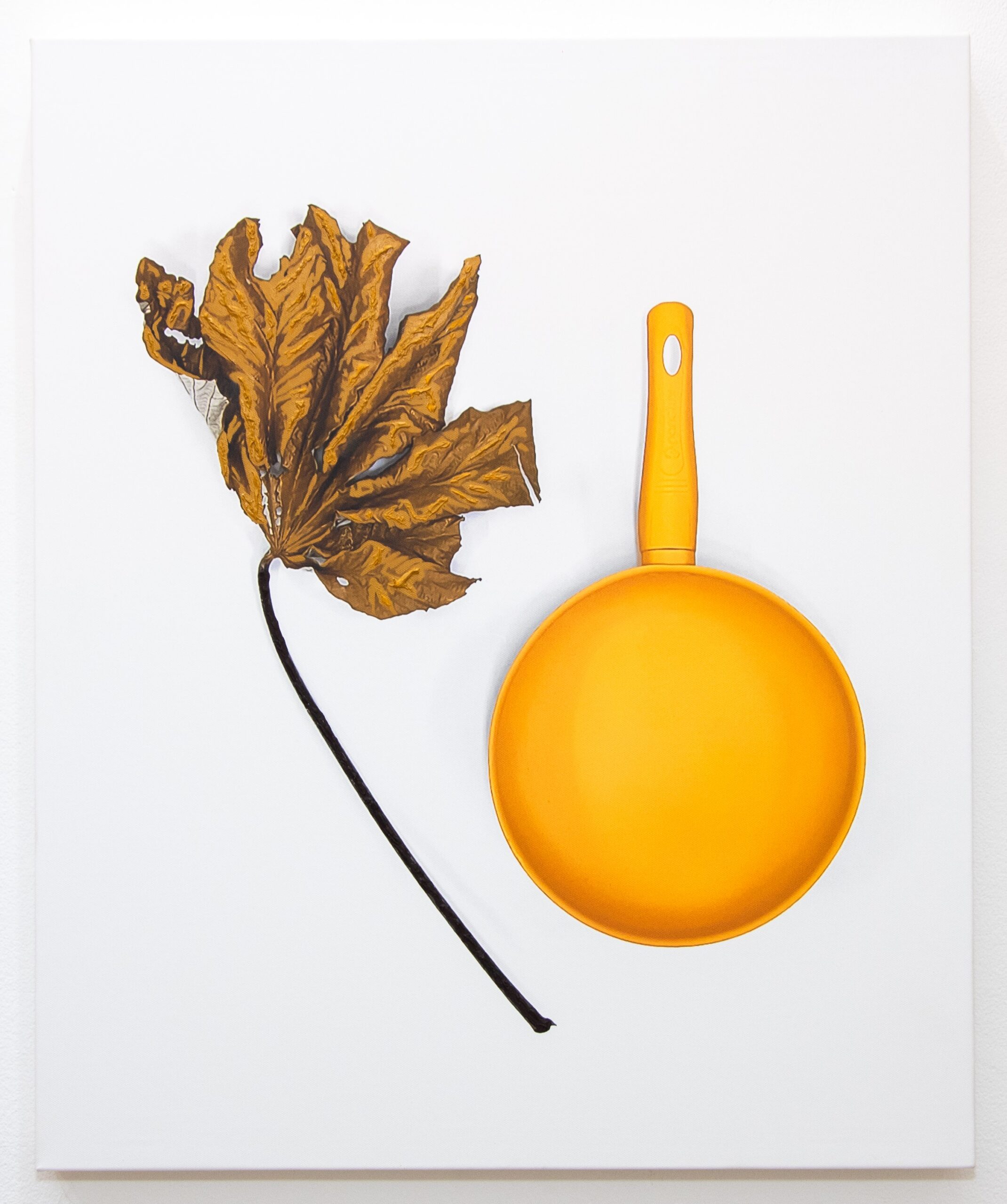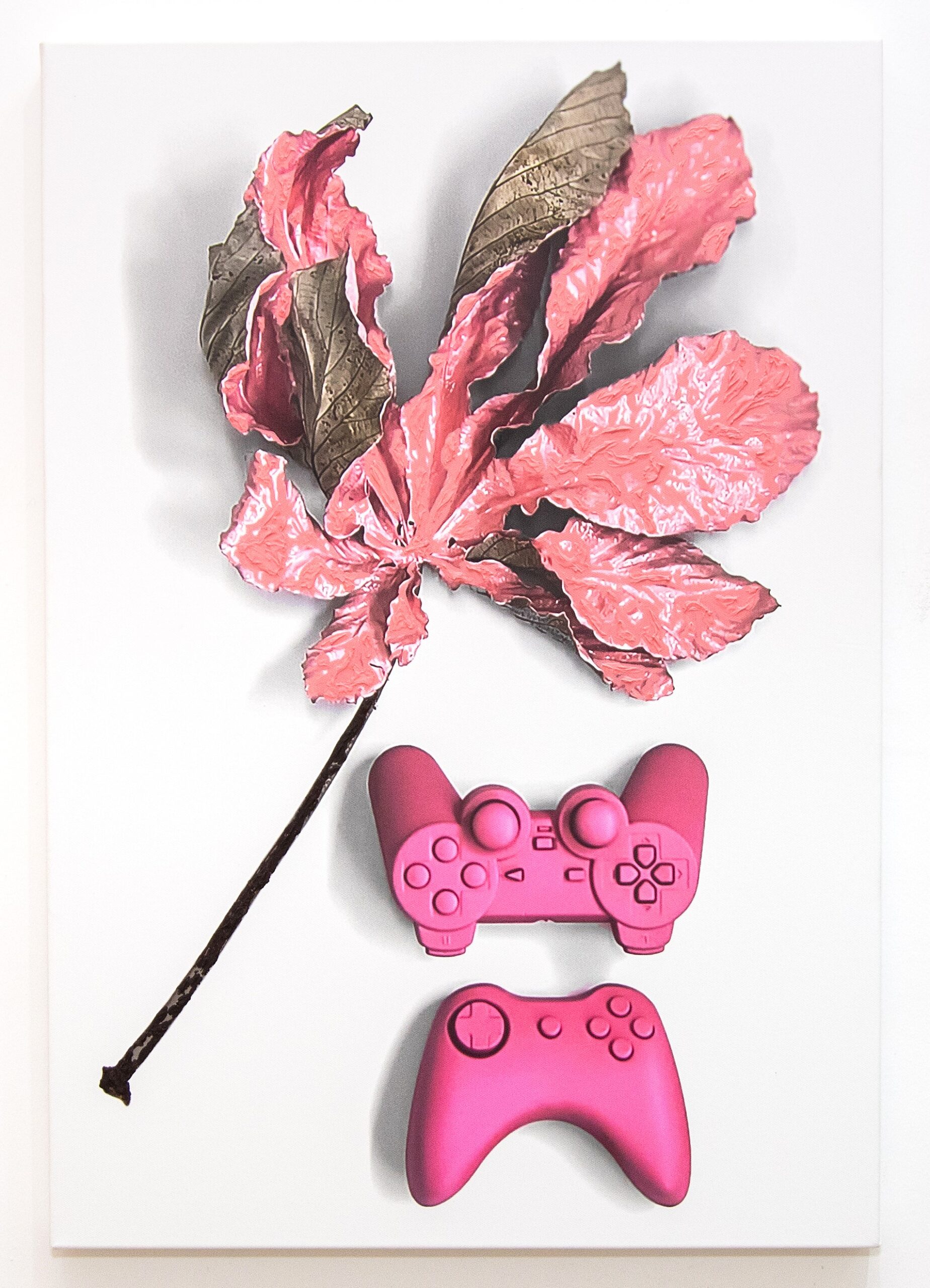 As três fotografias pictóricas com intervenções em acrílica, aqui apresentadas, fazem parte da série ANTROPO MORIFAS (avessos). Nessas obras, joysticks, frigideiras e telefones convivem com folhas secas de embaúba, todos recobertos por camadas de esmalte spray e tinta acrílica em cores vibrantes. Ao romper com a homogeneização cromática típica da indústria, crio composições que ressaltam a singularidade e a potência estética desses objetos, instaurando novas camadas de sentido. Em ANTROPO MORFIAS (avessos), a proposta é entrelaçar matéria viva e matéria fabricada. Objetos como telefones, frigideiras e joysticks convivem com folhas de embaúba, cujas superfícies, pintadas na mesma cor dos objetos industriais, revelam o “avesso” de imagens e formas habitualmente naturalizadas. Ao nos depararmos com esses objetos descartáveis dispostos junto a folhas secas de embaúba, o orgânico e o inorgânico se fundem, formando pequenos núcleos escultóricos que suscitam provocações e ironias. A proposta remete às causas do Antropoceno e à importância do espaço que esses objetos ocupam no cotidiano da vida humana.