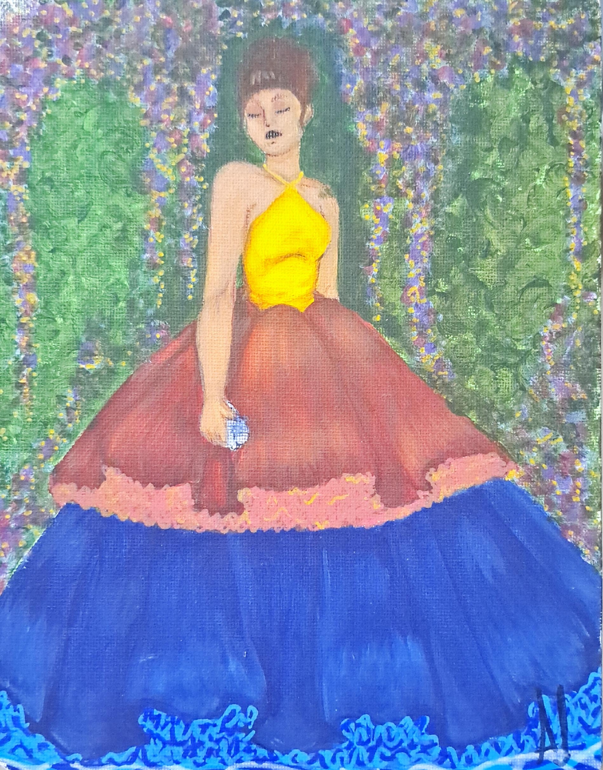 A série foi uma tentativa de traduzir um momento de luto e solidão, quando as palavras já não eram suficientes. A pintura tornou-se meu abrigo e minha forma de expressão: ao sujar as mãos de tinta e mergulhar nos detalhes, encontrei refúgio no silêncio da criação. Cada cor escolhida e cada posição no quadro carregavam pedaços da melancolia, das memórias que, por serem tão boas, deixaram saudade e trouxeram o peso do não querer acreditar. A moda, sempre presente em meu viver, também se fez arte nesse processo. Em formas volumosas e intensas, refletiu aquilo que transbordava de dentro de mim, traduzindo o que palavras jamais alcançariam. O quadro “Quando?” também faz parte de outra coleção minha chamada Nostalgia, na qual aquela lembrança desperta minha criatividade. Assim, as telas tornaram-se confissão e testemunho: guardaram dor, lembrança e beleza, transformando ausência em presença e fragilidade em arte. As respostas para o porquê, o onde e até mesmo o quando talvez permaneçam para sempre incertas. Contudo, na personagem que criei, há símbolos do meu sentir. Seus olhos fechados revelam a recusa em encarar a realidade, como se negar fosse a última forma de resistência. Por isso, o quadro final é memória dela mesma: uma versão envolta em cores mais vibrantes, voltada ao ambiente em vez do próprio corpo. A arte, nesse instante, foi minha ponte entre silêncio e expressão, entre saudade e esperança, entre dor e beleza. Uma tentativa de eternizar em cores aquilo que o coração não soube calar.